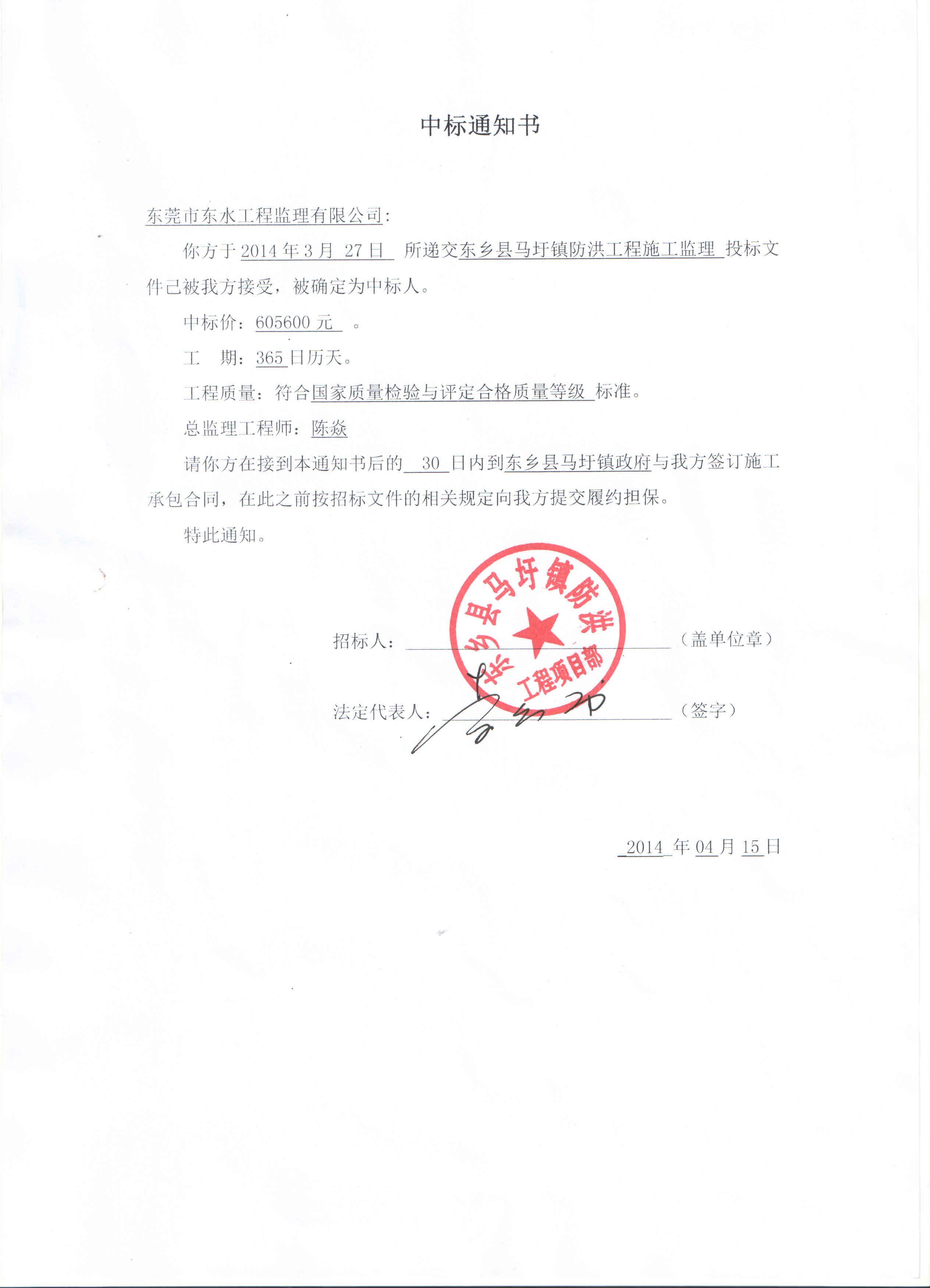 2014年3月27日江西省东乡县马圩镇防洪工程施工监理由我公司中标,中标金额为60.56万元。