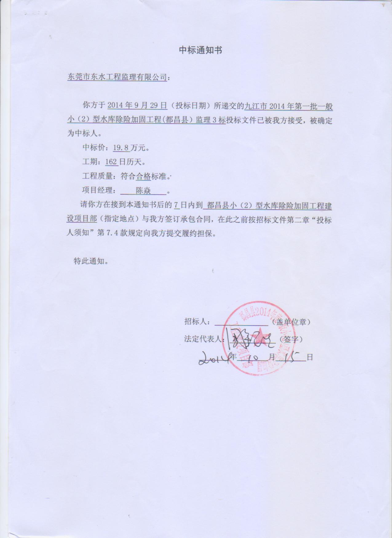 九江市2014年第一批一般小(2)型水库除险加固工程(都昌县)监理3标,2014年10月15日由江西分公司中标,中标价为19.8万元。