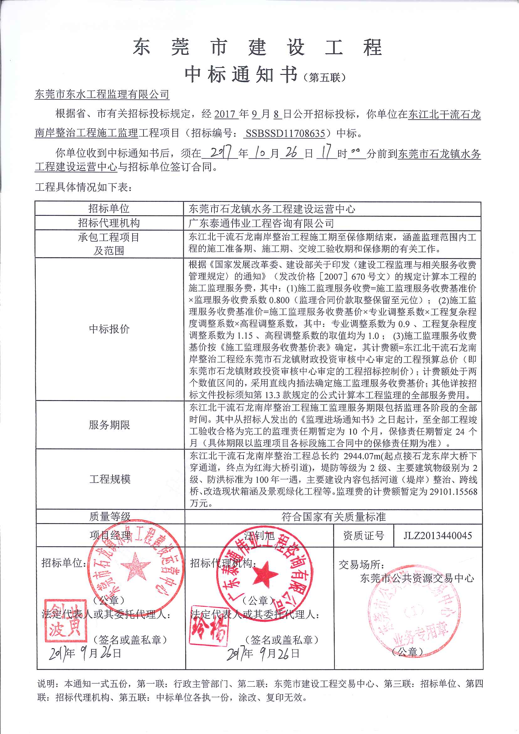 东江北干流石龙南岸整治工程施工监理工程项目中标通知书