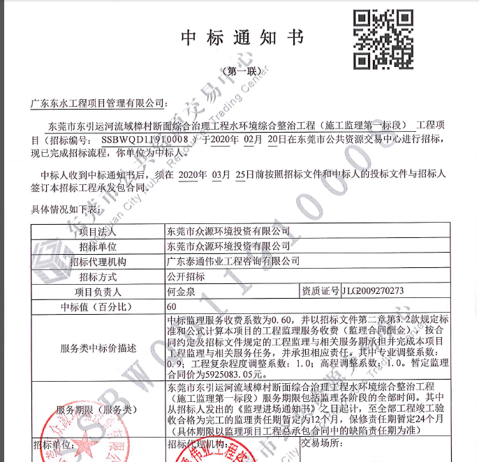 东莞市东引运河流域樟村断面综合治理工程水环境综合整治工程(施工监理第一标段)工程项目。